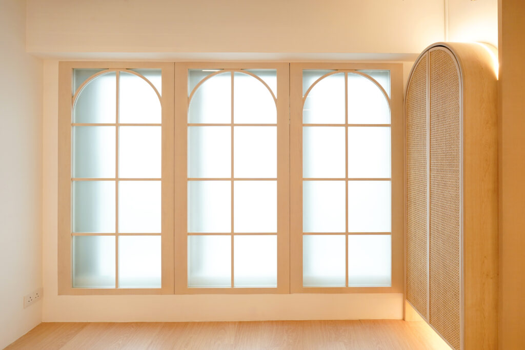 如果室內樓底高度較低,除了傳統的方形窗戶和門框設計,可以考慮加入圓弧元素的拱形設計。垂直的弧形能創造出向上延伸的錯覺,使空間在視覺上顯得更加寬敞。設計圓弧形的門框或拱門,不但為空間增添優雅感,還能形成視覺引導效果,增強空間的層次感。圓弧形的門窗亦可增強建築的獨特性和魅力,特別適合古典或現代風格的設計。搭配玻璃讓整體視覺更開闊,美觀加成同時營造出大氣的感覺。