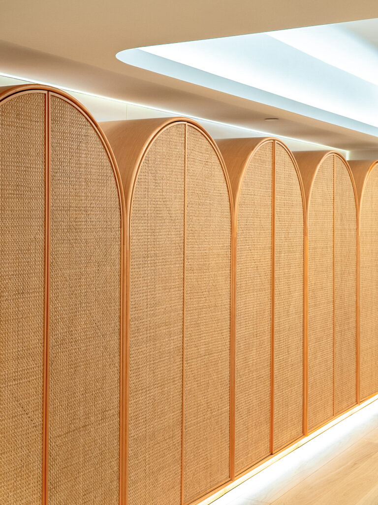 以圓弧曲線修飾牆面或門廊,視覺上有助放大空間感,還能增添優雅與美感。與直角牆角相比,圓形轉角能夠自然引導動線,提升空間柔和感,並減少壓迫感。此外,使用圓弧取代尖銳邊角,能減少空間使用者碰撞受傷的風險,變相增強安全性。