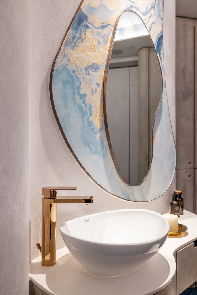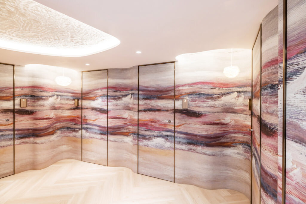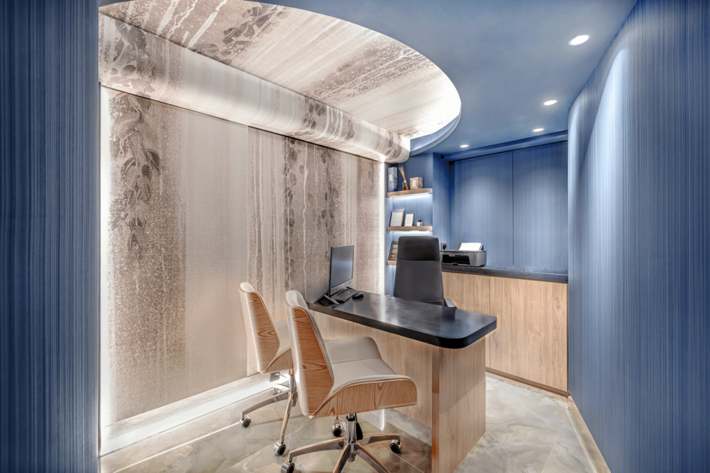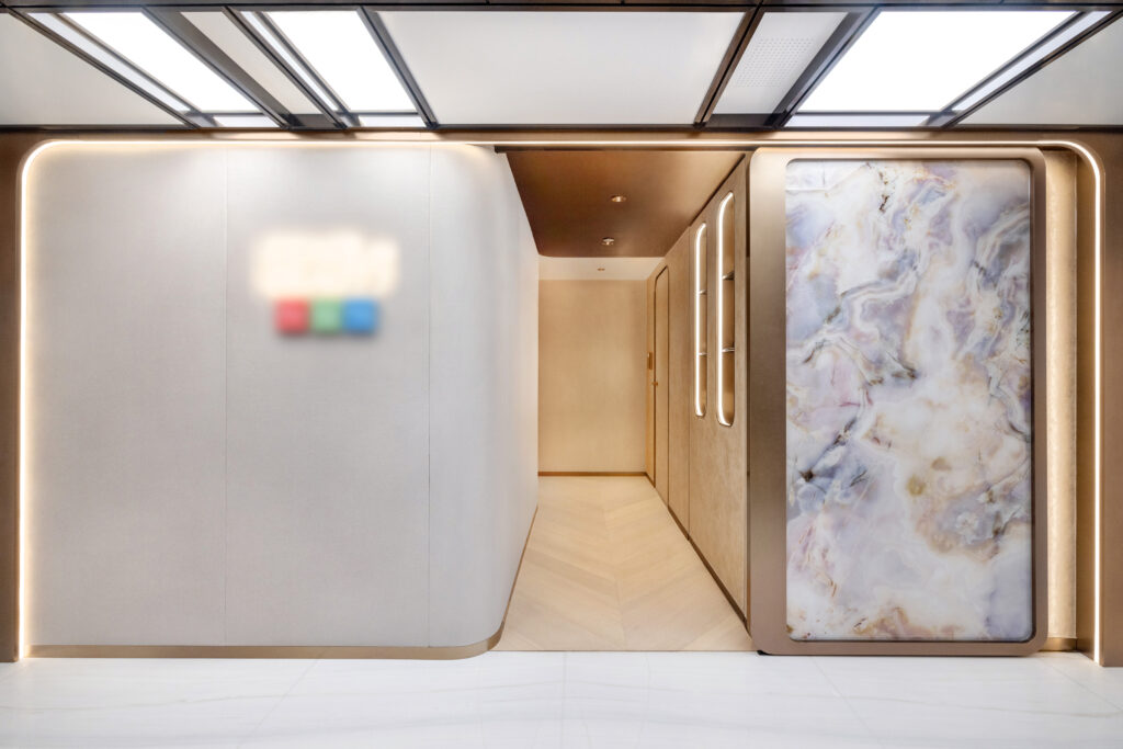 This is a 'River' theme-decorated beauty centre, bathed the interiors with a palette of rose gold colors and uneven surfaces on walls. 這是一家以「河流」為主題裝飾的美容中心,玫瑰金不鏽鋼牆身且不規則圓弧設計。