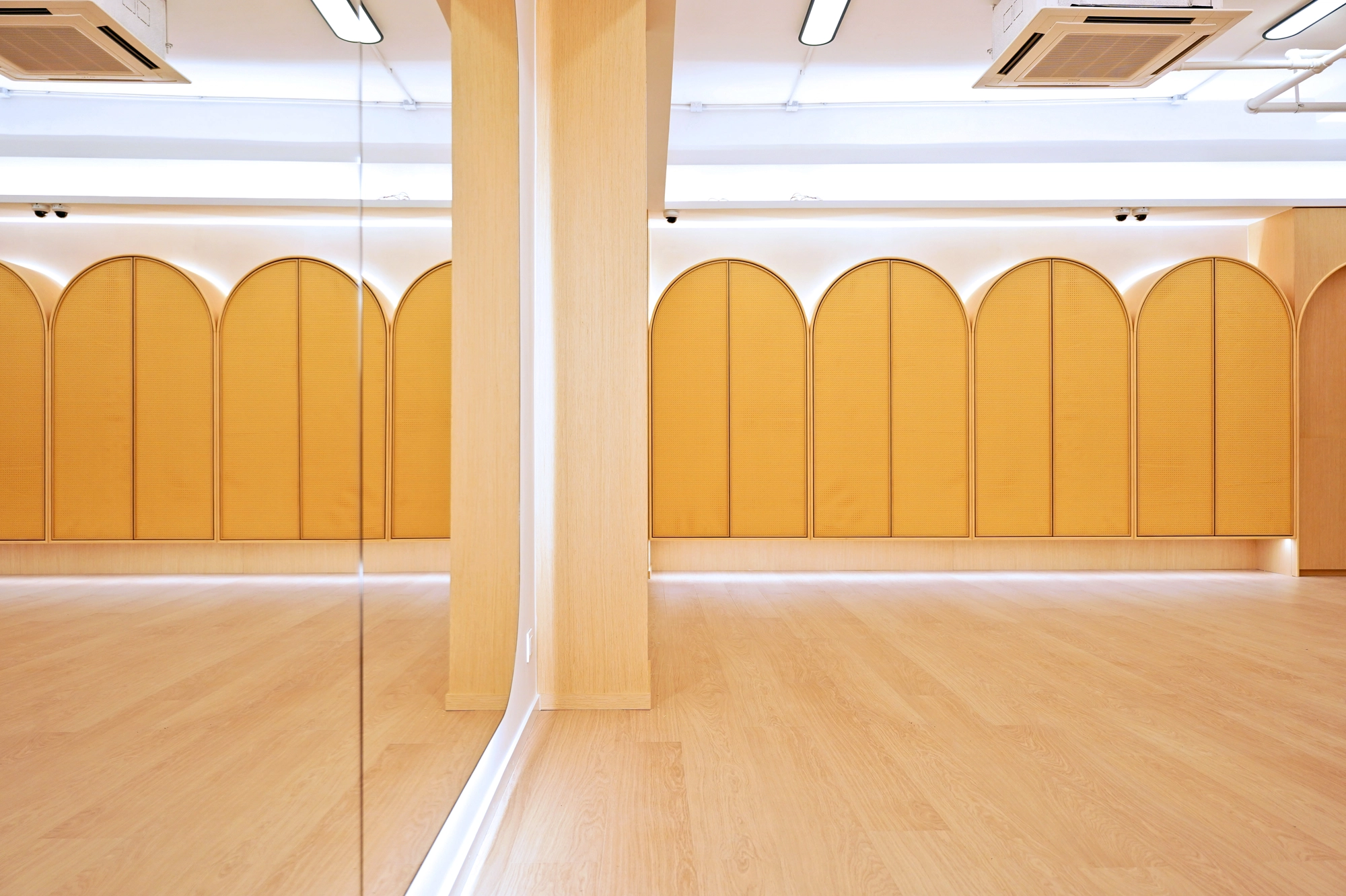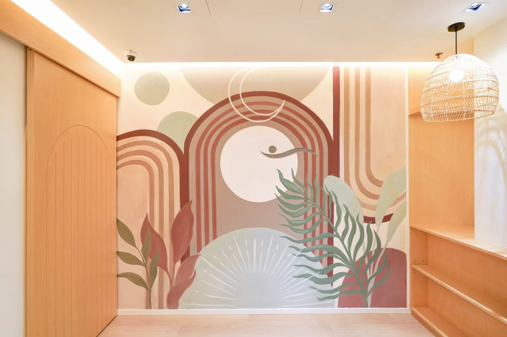 私人教室的特色牆畫,以柔和的色調及循環流線,呈現力量凝聚的視覺效果,為客戶營造心會神凝的氛圍。